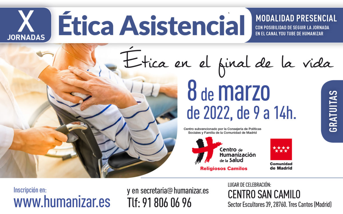 Un año más el Centro de Humanización de la Salud de los religiosos camilos, celebra la X Jornada de ética asistencial de forma presencial el próximo martes 8 de marzo de 2022. Organizadas por el Comité de ética del Centro, estas jornadas están dirigidas a profesionales y estudiantes, constituye una estupenda actividad para acercarse a la bioética y sus implicaciones en la atención humanizada a personas dependientes.