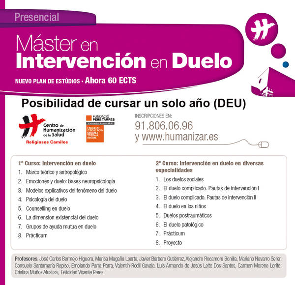 En España, la formación universitaria para intervenir en duelo, de carácter máster, es la que imparte el Centro de Humanización de la Salud en Tres Cantos (Madrid), de los Religiosos Camilos, impartido por profesores con larga experiencia en duelos complicados e intervención en crisis, etc.